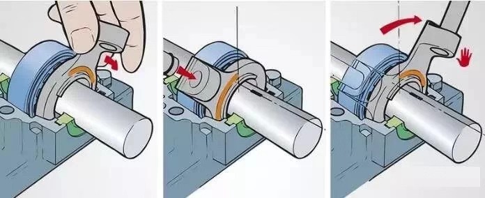 安裝時(shí)對(duì)軸承施加的作用力,絕不可通過滾動(dòng)體從一個(gè)軸承圈傳遞到另一個(gè)軸承圈,否則可能會(huì)對(duì)滾道造成損壞。但在任何情況下,都不可以直接敲擊軸承圈、保持架、滾動(dòng)體或密封件。
